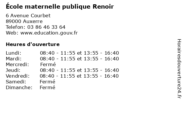 1 École Elémentaire Publique Renoir (Distance: 0,07 km) 4 Avenue Courbet, 89000 Auxerre cours, education, elémentaire, publique, renoir, services, École, école, élémentaire 2 École primaire publique - Auxerre (Distance: 0,10 km) 12 Avenue Courbet, 89000 Auxerre augy, auxerre, ecole, education, maternelle, primaire, publique, services, école 3 École maternelle d'application Rosoirs (Distance: 0,95 km) 13 Rue de la Tour Auvergne, 89000 Auxerre d'application, ecole, education, maternelle, rosoirs, services, école 4 École maternelle publique du Temple (Distance: 1,59 km) 12 Rue Marcellin Berthelot, 89000 Auxerre du, ecole, education, maternelle, publique, services, temple, école 5 École élémentaire publique Martineau-des-Chesnez (Distance: 1,60 km) 9 Rue Martineau des Chesnez, 89000 Auxerre chesnez, des, ecole, education, martineau, maternelle, publique, services, école, élémentaire 6 École maternelle publique Les Clairions (Distance: 1,95 km) 1 Rue de la Maladière, 89000 Auxerre clairions, ecole, education, les, maternelle, publique, services, école |