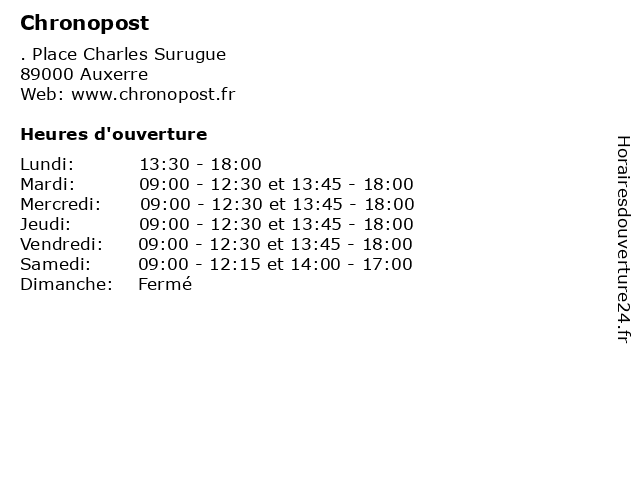 1 Chronopost (Distance: 0,59 km) . Saint-Simon, 89000 Auxerre chronoplast, chronopost, expédition, livraison, services 2 Chronopost (Distance: 0,60 km) 110 Rue du Pont, 89000 Auxerre chronoplast, chronopost, expédition, livraison, services 3 Chronopost (Distance: 0,71 km) 48 Boulevard Vaulabelle, 89000 Auxerre chronoplast, chronopost, expédition, livraison, services 4 Chronopost (Distance: 0,98 km) 44 Avenue de la Puisaye, 89000 Auxerre chronoplast, chronopost, expédition, livraison, services 5 Chronopost (Distance: 1,27 km) 69 Rue Theodore de Beze, 89000 Auxerre chronoplast, chronopost, expédition, livraison, services 6 Chronopost (Distance: 1,38 km) 72 Avenue Delacroix, 89000 Auxerre chronoplast, chronopost, expédition, livraison, services |