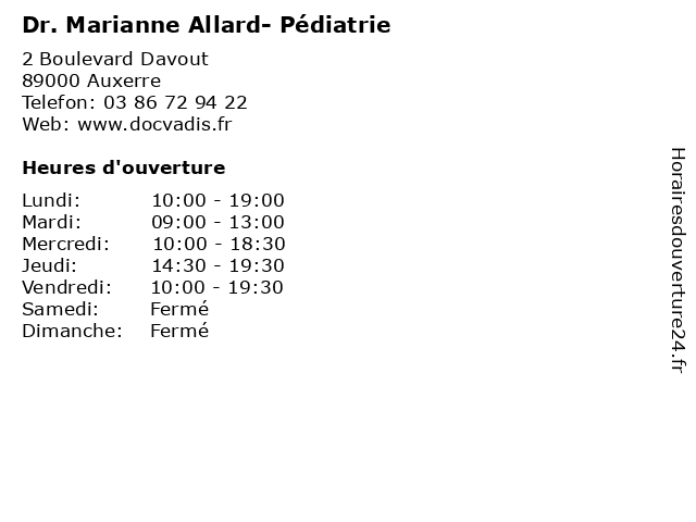 1 Cabinet de Pédiatrie du Docteur Allard (secrétariat) (Distance: 0,00 km) 2 Boulevard Davout, 89000 Auxerre allard, cabinet, consultation, de, docteur, du, médecins, pédiatrie, santé, secrétariat 2 Marianne Michault - Psychologue (Distance: 0,14 km) 2bis Rue Renan, 89000 Auxerre marianne, michault, psy, psychiatre, psychologue, sante, soins 3 Dr Nadia Boudar - Pédiatre (Distance: 0,51 km) 29 Place de l'Hôtel de Ville, 89000 Auxerre boudar, docteur, dr, enfant, nadia, pédiatre, pédiatrie, santé 4 Centre Hospitalier Sens - Pédiatrie (secrétariat ) (Distance: 48,91 km) 1 avenue Pierre de Coubertin, 89100 Sens centre, consultation, docteur, hospitalier, pédiatrie, santé, secrétariat, sens 5 Dr Anne Six Beneton - Pédiatre (Distance: 50,08 km) 6 Quai Jean Moulin, 89100 Sens anne, bebe, beneton, dr, nourisson, pédiatre, pédiatrie, six |