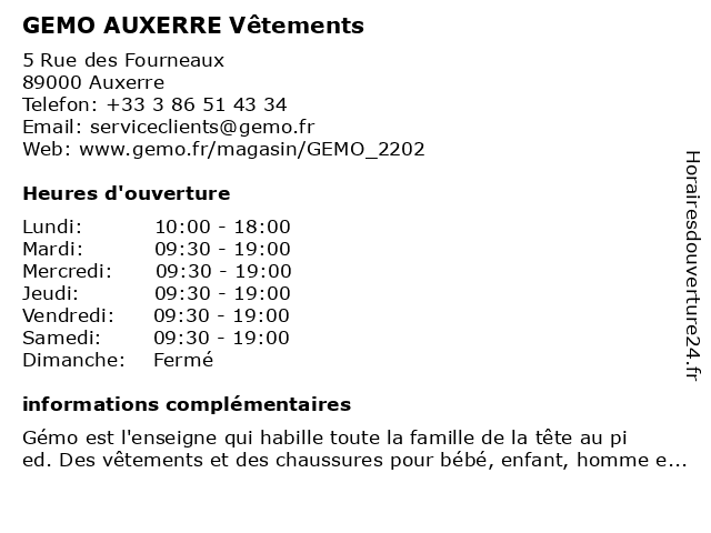 1 GEMO AUXERRE Chaussures (Distance: 0,03 km) 12 Rue des Fourneaux, 89000 Auxerre auxerre, bijoux et accesoires, chaussures, gemo, lingerie, magasin bébé, maroquinerie, mode et habillement, vêtements bébé, vêtements enfant, vêtements femme, vêtements homme 2 GEMO JOIGNY Chaussures et Vêtements (Distance: 23,45 km) Rue des Entrepreneurs, 89300 Joigny bijoux et accesoires, chaussures, et, gemo, joigny, lingerie, magasin bébé, maroquinerie, mode et habillement, vêtements, vêtements bébé, vêtements enfant, vêtements femme, vêtements homme 3 Boutique Louis (Distance: 43,96 km) 30 Grande rue Aristide Briand, 89200 Avallon accesoires, boutique, chaussures, jeans, louis, pantalons, tendances, vestes, vetements 4 GEMO SENS Chaussures et Vêtements (Distance: 45,39 km) Avenue Henri Delanne, 89100 Sens bijoux et accesoires, chaussures, et, gemo, lingerie, magasin bébé, maroquinerie, mode et habillement, sens, vêtements, vêtements bébé, vêtements enfant, vêtements femme, vêtements homme 5 Chaussea (Distance: 0,04 km) 8 rue des Fourneaux, 89000 Auxerre accessoires, chaussea, chaussures, magasin, maroquinerie 6 Action Auxerre (Distance: 0,06 km) Rue des Fourneaux, 89000 Auxerre action, animaux domestiques, articles de sport, articles ménagers, auxerre, boissons & alimentation, bricolage, cuisine, habitat, hobby, hygiène & beauté, jardin, jouets, mode, multimédia, papeterie & bureau, voyages |