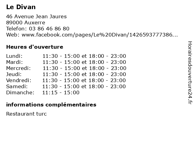 | Samedi | 11:30-15:00 et 18:00-23:00 |