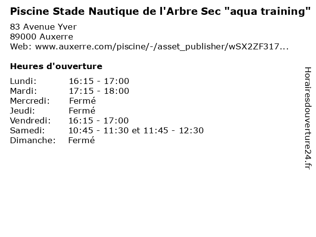 1 Piscine Stade Nautique de l'Arbre Sec "horaires d'ouverture au public en période scolaire" "Grand bassin" (Distance: 0,00 km) 83 Avenue Yver, 89000 Auxerre "grand, "horaires, au, bassin", d'ouverture, de, en, l'arbre, nautique, piscine, public, période, scolaire", sec, stade 2 Piscine Stade Nautique de l'Arbre Sec "horaires d'ouverture au public en période scolaire" "petit bassin" (Distance: 0,00 km) 83 Avenue Yver, 89000 Auxerre "horaires, "petit, au, bassin", d'ouverture, de, en, l'arbre, nautique, piscine, public, période, scolaire", sec, stade 3 Piscine Stade Nautique de l'Arbre Sec "cours Aqua-trampo" (Distance: 0,00 km) 83 Avenue Yver, 89000 Auxerre "cours, aqua, de, l'arbre, nautique, piscine, sec, stade, trampo" 4 Piscine Stade Nautique de l'Arbre Sec "aqua phobie" (Distance: 0,00 km) 83 Avenue Yver, 89000 Auxerre "aqua, de, l'arbre, nautique, phobie", piscine, sec, stade 5 Piscine Stade Nautique de l'Arbre Sec "aqua formes" (Distance: 0,00 km) 83 Avenue Yver, 89000 Auxerre "aqua, de, formes", l'arbre, nautique, piscine, sec, stade 6 Mondial Piscine - Auxerre Loisirs (Distance: 9,34 km) 71 B Route d'Auxerre, 89380 Appoigny auxerre, auxerre loisirs, beton, exterieur, interieur, loisirs, mondial, picine, piscine |