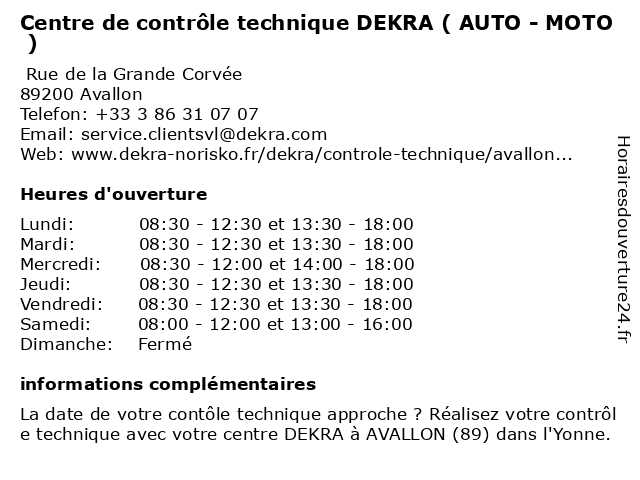 Description de l'entreprise :Préparer votre contrôle techniquePour préparer votre contrôle technique dans notre centre DEKRA de Avallon, vous pouvez vérifier en amont différents points comme les pneumatiques, la visibilité, le niveau d'huile ou encore l'habitacle. Pour tout savoir, consultez notre vidéo. Voir l'offre |