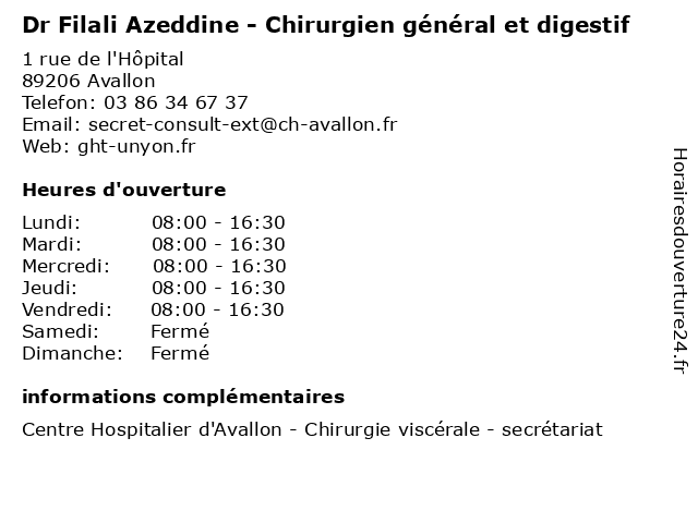 1 Dr Benabdella Chakib - Chirurgien général et digestif (Distance: 0,00 km) 1 rue de l'Hôpital, 89206 Avallon benabdella, chakib, chirurgie, chirurgien, consultation, digestif, docteur, dr, et, général, med, médecin, médecine, secrétariat, traitement, viscérale 2 AXA Chaumard Marc Agent général (Distance: 0,25 km) 4 Place Vauban, 89200 Avallon agent, axa, chaumard, général, marc 3 Allianz Assurances Veronique Gouache Agent Général (Distance: 29,00 km) 9 Rue Marie Davy, 58500 Clamecy agent, allianz, assurances, gouache, général, veronique 4 Dr Azeddine Mohammed Filali - Chirurgien viscéral (Distance: 43,68 km) 2 Boulevard de Verdun, 89011 Auxerre autre, azeddine, chirurgie, chirurgien, consultation, docteur, dr, dr., filali, mohammed, santé, viscéral, viscérale 5 Dr Michel Poinsard - Chirurgien viscéral et digestif (Distance: 43,98 km) 5 Avenue de la Fontaine Sainte-Marguerite, 89000 Auxerre chirurgie, chirurgien, digestif, dr, et, general, michel, poinsard, soins, viscéral 6 Dr Julien Sakat - Chirurgien viscéral et digestif (Distance: 43,98 km) 5 Avenue de la Fontaine Sainte-Marguerite, 89000 Auxerre chirurgien, digestif, docteur, dr, et, julien, sakat, sante, soins, viscéral |