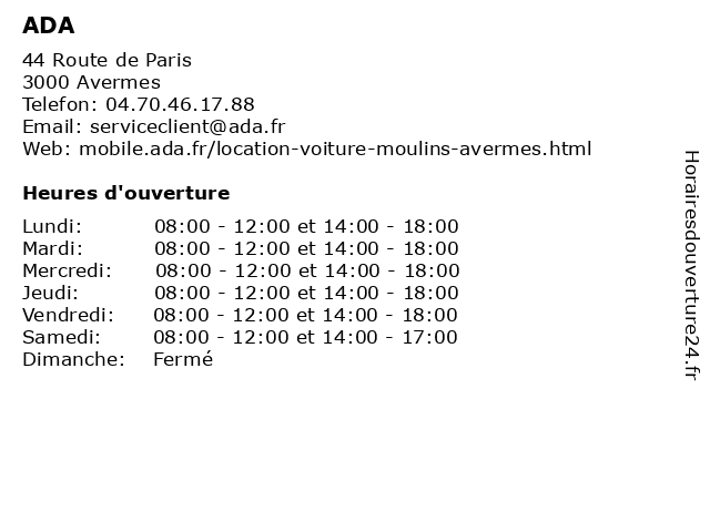 1 Ada (Distance: 3,32 km) 28 Route de Lyon, 03400 Yzeure ada, auto, location de voiture, roulez, vehicules 2 Autolagon (Distance: 0,00 km) 44 route de Paris, 03000 Avermes agence, autolagon, location, utilitaires, véhicules 3 Ada (Distance: 28,84 km) 14 Rue du Moulin, 58240 Saint Pierre le Moutier ada, agence, location, services, utilitaires, voitures, voyages 4 Ada (Distance: 29,82 km) 175 Route Nationale, 58300 Saint Leger des Vignes ada, agence, location, services, utilitaires, voitures, voyages 5 ADA (Distance: 49,18 km) 22 Boulevard Camille Dagonneau, 58640 Varennes Vauzeles ada, auto, location de voiture, roulez, vehicules 6 |
