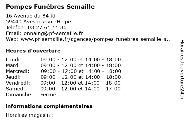 1 Pompes Funèbres Semaille (Distance: 11,92 km) 2 Chemin du Cimetière, 59620 Aulnoye-Aymeries accompagnement, deuil, décès, familles, funèbres, funérarium, mort, pompes, semaille 2 Pompes Funèbres Semaille (Distance: 19,73 km) 2 Rue Jean Jaurès, 59750 Feignies accompagnement, deuil, décès, familles, funèbres, funérarium, mort, pompes, semaille 3 Pompes Funèbres et Marbrerie JOUVIN (Distance: 0,58 km) 16 Place du Général Leclerc, 59440 Avesnes Sur Helpe administration, assoc, associations, aux, bussières, d'information, de, des, dédié, et, funèbres, greffe, information, jouvin, local, locale, mairie, marbrerie, mission, pompes 4 Pompes Funèbres et Marbrerie HEUCLIN - PFG FELLERIES (Distance: 7,85 km) 9 Rue de la Place, 59740 Felleries avis de décès, crémation, entretien de sépulture, et, felleries, fleurs deuil, formalités après obsèques, funèbres, heuclin, inhumation, marbrerie, monument funéraire, pfg, pompes, pompes funèbres, prévoyance obsèques 5 Pompes funèbres PFG HAUTMONT (Distance: 14,51 km) 10 Place du Général de Gaulle, 59330 Hautmont avis de décès, crémation, entretien de sépulture, fleurs deuil, formalités après obsèques, funèbres, hautmont, inhumation, marbrerie, monument funéraire, pfg, pompes, pompes funèbres, prévoyance obsèques 6 Pompes Funèbres Marbrerie De La Thure (Distance: 14,80 km) 1 Avenue de Ferrière, 59330 Hautmont de, funèbres, la, marbrerie, pompes, thure |