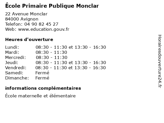 | Lundi | 08:30-11:30 et 13:30-16:30 |