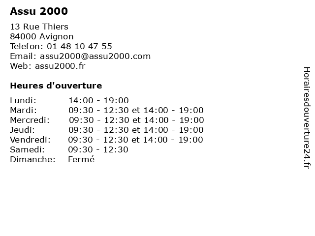 1 Assu 2000 (Distance: 1,14 km) 64 Avenue Saint-Ruf, 84000 Avignon 2000, assu, assurance, maison, moto, santé, services 3 Audioprothésiste Les Angles - Audio 2000 (Distance: 5,28 km) 1 Avenue de Tavel, 31133 Les Angles 2000, angles, audio, audioprothésiste, les 6 Optic 2000 (Distance: 17,80 km) 31 Boulevard Marceau, 13210 Saint-Rémy-de-Provence 2000, lentilles, lunettes, montures optiques, optic, opticien, opticiens, verres |