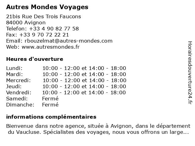 1 Jetset Voyages / Autres Mondes Voyages (Distance: 0,02 km) 21 Rue des 3 Faucons, 84000 Avignon agence, autres, billet d'avion et hôtel pour votre club, jetset, mondes, séjour, voyages 2 Jetset Voyages / Provence Voyages (Distance: 0,25 km) 3 Boulevard Raspail, 84007 Avignon agence, billet d'avion et hôtel pour votre club, jetset, provence, séjour, voyages 5 Jetset Voyages / Bénézet Voyages (Distance: 0,56 km) 79 Rue Guillaume Puy, 84000 Avignon agence, billet d'avion et hôtel pour votre club, bénézet, jetset, séjour, voyages 6 Cap Sud Voyages (Distance: 2,92 km) 162 Avenue Pierre Semard, 84000 Avignon cafe, cap, chaussures, enfants, homme, lingerie, mode femme, restaurant, service, shopping, sud, voyages  |