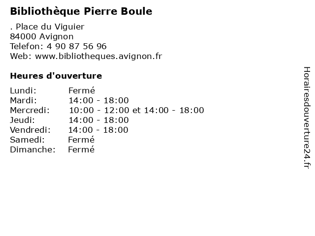 1 Bibliothèque universitaire Maurice Agulhon - Campus Hannah Arendt (Distance: 1,31 km) 74 rue Louis Pasteur, 84018 Avignon agulhon, arendt, bibliothèque, campus, hannah, livre, maurice, universitaire, université, étudiant 2 Bibliothèque St Chamand (Distance: 1,83 km) . Avenue François Mauriac, 84000 Avignon bibliothèque, chamand, livre, médiathèque, services, st 3 Bibliothèque Ceccano (Adultes) (Distance: 2,16 km) 2 Rue Laboureur, 84000 Avignon adultes, bibliothèque, ceccano, livre, médiathèque, services 4 Bibliothèque Ceccano (Jeunesse-Périodes Scolaires) (Distance: 2,16 km) 2 Rue Laboureur, 84000 Avignon bibliothèque, ceccano, jeunesse, livre, médiathèque, périodes, scolaires, services 5 Bibliothèque Ceccano (Jeunesse-Vacances Scolaires) (Distance: 2,16 km) 2 Rue Laboureur, 84000 Avignon bibliothèque, ceccano, jeunesse, livre, médiathèque, scolaires, services, vacances 6 Bibliothèque Champfleury (Distance: 3,07 km) 2 Rue Marie Madeleine, 84000 Avignon bibliothèque, champfleury, livre, médiathèque, services |