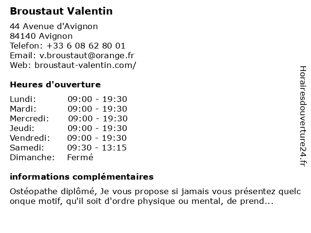 1 Comité Valentin Haüy (Distance: 5,76 km) 16 Rue Marie-Madeleine, 84000 Avignon braille, comité, haüy, magasin, malvoyants, matériel, téléphone, valentin 2 Maître Claire Valentin - Avocate (Distance: 15,14 km) 400 Chemin du Pont de la Sable, 84800 L'Isle-sur-la-Sorgue accident de la route, agression, avocat, avocate, claire, corporel, dommage, dommage corporel, droit, du, en, erreur médicale, infection nosocomiale, maître, spécialiste, valentin 3 Brasserie le Valentin (Distance: 15,27 km) - Galerie Intermarché, 84800 L'Isle-sur-la-Sorgue bar, bistro, bistrot, brasserie, café, le, restaurant, restauration, valentin 4 Valentin Sors - Chiropracteur (Distance: 15,36 km) 751 Cours Fernande Peyre, 84800 L'Isle-sur-la-Sorgue chiro, chiropracteur, sante, soins, sors, valentin 5 Sophie Valentin Architecture Intérieur (Distance: 16,52 km) 38 Avenue du Clos Mozart, 13210 Saint-Rémy-de-Provence architecture, intérieur, sophie, valentin 6 Multi-Accueil Eugène Valentin (Distance: 17,59 km) 119 avenue Elsa Triolet, 84300 Cavaillon accueil, activité, creche, enfant, eugène, eveil, garderie, multi, valentin |