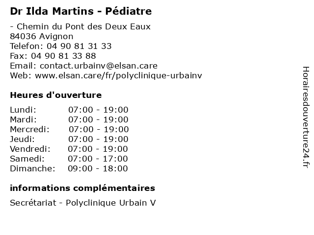 1 Dr Michel Sarran - Pédiatre (Distance: 0,00 km) - Chemin du Pont des Deux Eaux, 84036 Avignon consultation, docteur, dr, med, michel, médecin, médecine, pediatre, pédiatre, sarran, traitement 2 Dr Marie Chambost - Pédiatre (Distance: 0,01 km) 47 Chemin Du Pont Des Deux Eaux, 84000 Avignon chambost, dr, enfant, marie, medecin, pediatre, pédiatre, soins 3 Dr Akima Agoudjil - Pédiatre (Distance: 3,60 km) 305 Rue Raoul Follereau, 84000 Avignon agoudjil, akima, consultation, docteur, dr, med, médecin, médecine, pédiatre, traitement 4 Dr. Emilie Briard - Pédiatre (Distance: 3,60 km) 305 Rue Raoul Follereau, 84000 Avignon briard, consultation, docteur, dr., emilie, med, médecin, médecine, pédiatre, traitement 5 Dr. Florence Joubert - Pédiatre (Distance: 3,60 km) 305 Rue Raoul Follereau, 84000 Avignon consultation, docteur, dr., florence, joubert, med, médecin, médecine, pédiatre, traitement 6 Dr Amandine Schott - Pédiatre (Distance: 3,60 km) 305 Rue Raoul Follereau, 84000 Avignon amandine, consultation, docteur, dr, med, médecin, médecine, pédiatre, schott, traitement |
