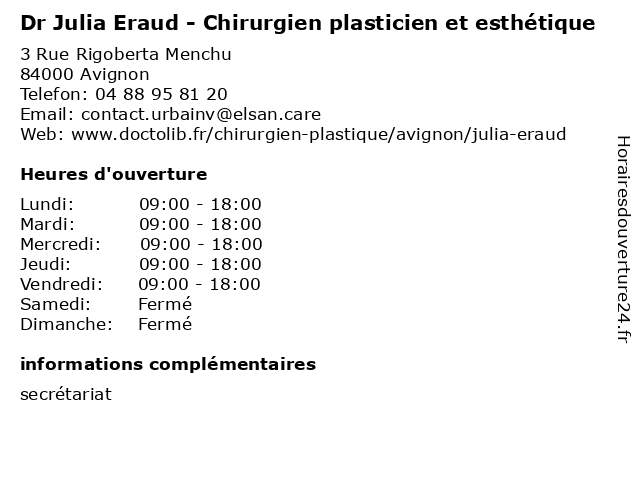 1 Dr Julia Villeret - Anatomo-cyto-pathologiste (Distance: 1,87 km) 305 Rue Raoul Follereau, 84000 Avignon anatomo, consultation, cyto, docteur, dr, julia, med, médecin, pathologiste, traitement, villeret 2 Julia Gatti - Sage-femme (Distance: 1,87 km) 305 Rue Raoul Follereau, 84000 Avignon consultation, docteur, dr, femme, gatti, julia, med, médecin, sage, traitement 3 Maître Julia Martinez - Avocate (Distance: 2,66 km) 8 boulevard Saint-Michel, 84000 Avignon avocat, avocate, droit, julia, juridictionnelle, martinez, maître, négociation 4 Dr Julia Testou - Orthodontiste (Distance: 3,06 km) 4 Avenue Pierre Semard, 84000 Avignon consultation, docteur, dr, julia, med, médecin, médecine, orthodontiste, secrétariat, testou, traitement 5 Dr Julia Testou - Chirurgien-dentiste (Distance: 3,06 km) 4 Avenue Pierre Semard, 84000 Avignon chirurgien, consultation, dentiste, docteur, dr, julia, med, médecin, testou, traitement 6 Institut Am Esthétique (Distance: 7,23 km) 2 rue Franz Ehrle, 84140 Avignon am, beauté, esthétique, institut, manucure, salon, spa |