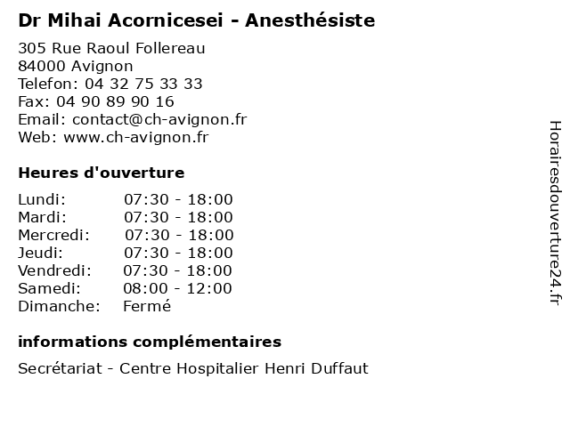 1 Dr Eric Arsac - Anesthésiste (Distance: 0,00 km) 305 Rue Raoul Follereau, 84900 Avignon anesthésiste, arsac, consultation, docteur, dr, eric, med, médecin, traitement 2 Dr Ionela Acornicesei - Anesthésiste (Distance: 0,00 km) 305 Rue Raoul Follereau, 84900 Avignon acornicesei, anesthésiste, consultation, docteur, dr, ionela, med, médecin, traitement 3 Dr Narcisa Botos - Anesthésiste (Distance: 0,00 km) 305 Rue Raoul Follereau, 84900 Avignon anesthésiste, botos, consultation, docteur, dr, med, médecin, narcisa, traitement 4 Dr Pierre Vachon - Anesthésiste (Distance: 0,53 km) 1750 Chemin du Lavarin, 84000 Avignon anesthésiste, consultation, docteur, dr, med, médecin, médecine, pierre, traitement, vachon 5 Dr Kamel Amrouni - Anesthésiste (Distance: 0,54 km) 1750 Chemin du Lavarin, 84000 Avignon amrouni, anesthésiste, consultation, docteur, dr, kamel, med, médecin, médecine, traitement 6 Dr Vanessa Haardt - Anesthésiste (Distance: 1,78 km) 23 boulevard Gambetta, 84000 Avignon anesthésiste, consultation, docteur, dr, haardt, med, médecin, médecine, traitement, vanessa |
