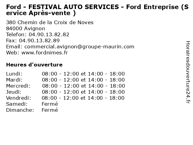 1 Ford - FESTIVAL AUTO SERVICES - Véhicules Neufs (Service Après-vente ) (Distance: 0,00 km) 380 Chemin de la Croix de Noves, 84000 Avignon après, auto, entretien, festival, ford, neufs, révisions, service, services, services d'automobiles, vente, vidanges, véhicules 2 Ford - FESTIVAL AUTO SERVICES - Véhicules d'Occasion (Service Après-vente ) (Distance: 0,00 km) 380 Chemin de la Croix de Noves, 84000 Avignon après, auto, d'occasion, entretien, festival, ford, révisions, service, services, services d'automobiles, vente, vidanges, véhicules 3 Ford - FESTIVAL AUTO SERVICES - Financement (Service Après-vente ) (Distance: 0,00 km) 380 Chemin de la Croix de Noves, 84000 Avignon après, auto, entretien, festival, financement, ford, révisions, service, services, services d'automobiles, vente, vidanges 4 Peugeot (Après vente) (Distance: 2,87 km) 540 Rue Charles Valente-Montfavet, 84036 Avignon après, automobiles, concéssionnaire, garage, motos, peugeot, vente 5 Ford - General ( Horaires Service Après-vente ) (Distance: 4,29 km) n/a Boulevard Ernest Genevet, 13160 Chateaurenard après, atelier de carrosserie, auto, car, financement, ford, ford entreprise, general, horaires, pièces et accessoires, service, vente, véhicules d’occasion, véhicules neufs 6 Ford - Magasin (Horaires Service Après-vente) (Distance: 4,29 km) n/a Boulevard Ernest Genevet, 13160 Chateaurenard après, atelier de carrosserie, auto, car, financement, ford, ford entreprise, horaires, magasin, pièces et accessoires, service, vente, véhicules d’occasion, véhicules neufs |