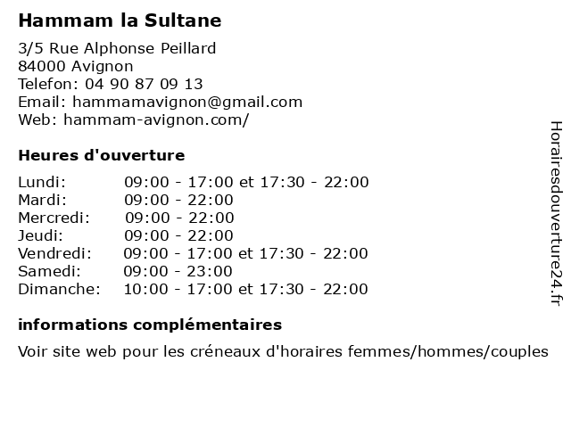 | Dimanche | 10:00-17:00 et 17:30-22:00 |