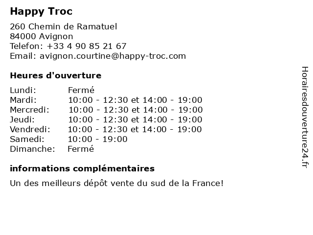 1 Troc (Distance: 0,88 km) 185 Route des Rémouleurs, 84000 Avignon deco, electro, loisirs, meubles, troc 2 Troc.com (Distance: 11,41 km) 666 route Carpentras, 84270 Vedène deco, electro, loisirs, meubles, troc, troc.com 3 Happy Burger (Distance: 11,61 km) 54 Chemin De La Grange Des Roues, 84700 Sorgues burger, happy, restaurants 4 So'Watt Happy Rock Diner (Distance: 17,37 km) 456 Route De l Isle Sur Sorgue, 84250 Le Thor diner, happy, restaurants, rock, so, sow, watt 5 Happy Immobilier (Distance: 23,24 km) 5 Route de Saint Rémy, 13520 Maussane-les-Alpilles agence, appartement, gestion, happy, immobilier, location, maison, transaction, vente 6 Happy Truck (Distance: 30,62 km) Happy Truck Les Cabanes De Barrau, 30127 Bellegarde adeleine, aivazian, happy, julie, marie, restaurants, truck |