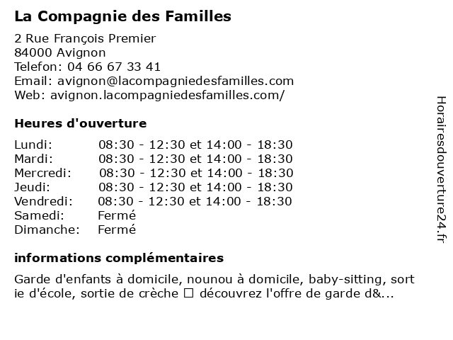 1 Centre d'Information sur les Droits des Femmes et des Familles (CIDFF) (Distance: 0,12 km) 2 places Alexandre farnèse, 84000 Avignon administration, assoc, centre, cidff, d'information, des, droits, et, familles, femmes, les, services, services publics, sur 2 La Compagnie des Chats - Bar à Chats (Distance: 2,10 km) 19 rue des Lices, 84000 Avignon bar, boissons, chats, compagnie, des, fruits, la, légumes, plats, salades 3 Compagnie Du Palais (Distance: 2,76 km) 1 Place Du Palais, 84000 Avignon compagnie, palais, restaurants 4 Huîtres & Compagnie (Distance: 3,00 km) 40 Avenue Général de Gaulle, 13870 Rognonas boissons, collations, compagnie, huitres, huîtres, restaurants, rognonas 5 Alexis & Compagnie (Distance: 3,27 km) 841 Avenue d'Avignon, 84140 Avignon alexis, avignon, compagnie, et, manuel, plomberie, plombier 6 La Compagnie de la Chaussure (Distance: 5,24 km) 1741 route de Marseille, 84140 Montfavet beauté, boutiques, chaussure, compagnie, de, déco, enfants, la, mode, mode femme, shopping |