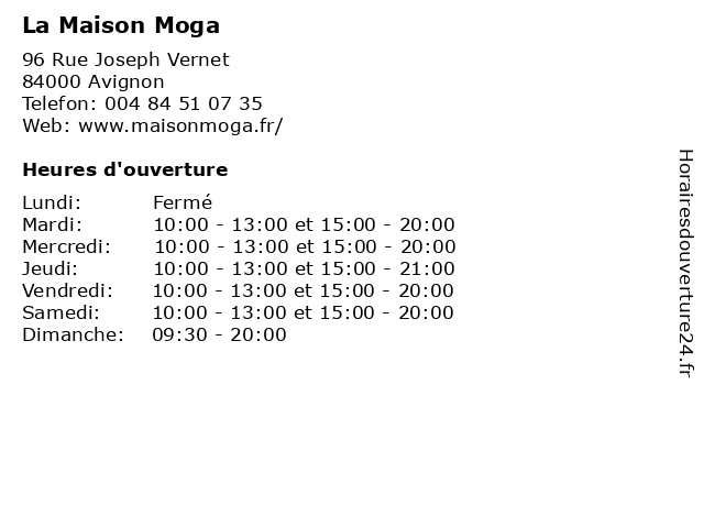 | Samedi | 10:00-13:00 et 15:00-20:00 |