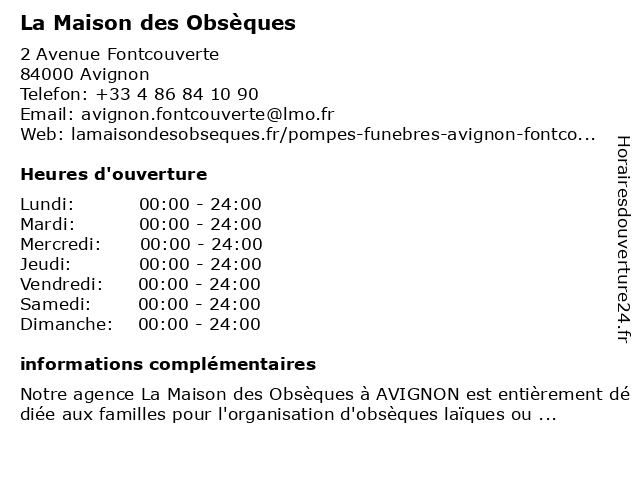 1 La Maison des Obsèques (Distance: 1,50 km) 4 Avenue Stuart Mill, 84000 Avignon des, la, maison, obsèques 3 Avignon Obsèques PFM Royalis (Distance: 1,55 km) Avenue Du Cimetiere, 84000 Avignon avignon, obsèques, pfm, royalis 5 APRIL MON ASSURANCE NIMES JAURÈS (Distance: 40,62 km) 50 Avenue Jean Jaurès, 30900 Nîmes april, assurance, assurance auto, assurance bateau, assurance habitation, assurance moto et 2 roues, assurance obsèques, assurance prévoyance, assurance prêt immobilier, assurance voyage, complémentaire santé, expatrié et assurance expatriation, jaurès, mon, nimes 6 Pompes Funèbres Musulmanes SALAM (Distance: 40,62 km) 2 Rue du Cadereau, 30900 Nîmes funèbres, inhumation, musulmanes, obsèques, pompes, pompes funèbres, salam, service funéraire |