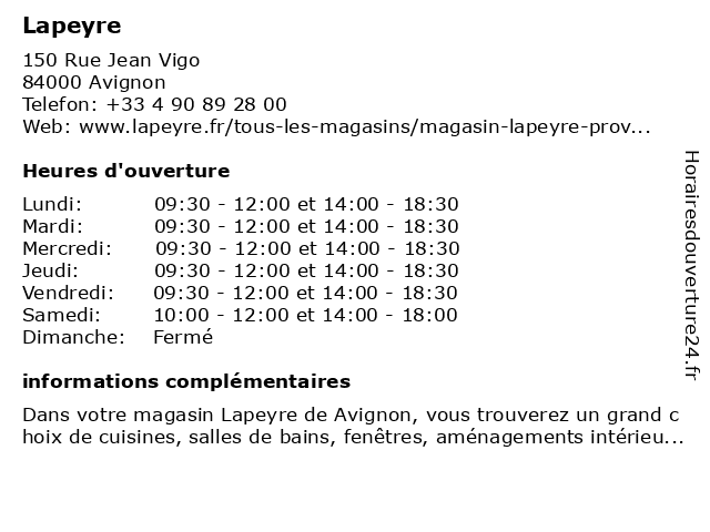 | 1 Lapeyre (Distance: 0,89 km) . Route de Marseille, 84140 Montfavet accessories, bains, cuisines, lapeyre, muebles 2 Lapeyre "Drive" (Distance: 0,01 km) 150 rue jena vigo, 84140 Montfavet "drive", chaîne, lapeyre, salles de bains et l'aménagement intérieur et extérieur de la maison, spécialisée dans les cuisines 3 Maître Bertrand Lapeyre - Avocat (Distance: 6,33 km) 18 Rue Armand de Pontmartin, 84000 Avignon avocat, avocate, bertrand, droit, juridictionnelle, lapeyre, maître, négociation 5 Lapeyre "Drive" (Distance: 42,20 km) 270 avenue michel debre, 30000 Nimes "drive", chaîne, lapeyre, salles de bains et l'aménagement intérieur et extérieur de la maison, spécialisée dans les cuisines |