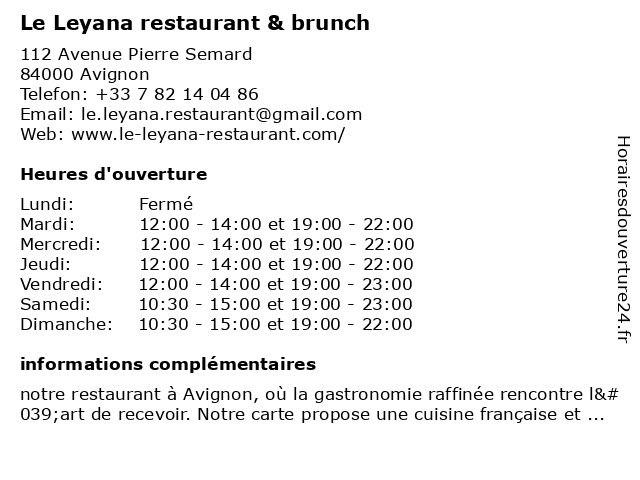 | Dimanche | 10:30-15:00 et 19:00-22:00 |