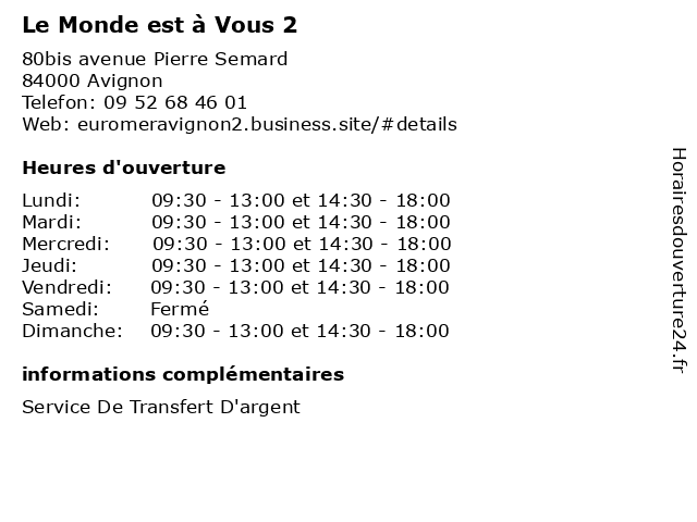 | Lundi | 09:30-13:00 et 14:30-18:00 |