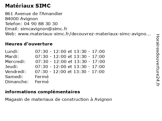 1 Matériaux SIMC (Distance: 13,64 km) 184 Avenue des Rouliers, 84170 Monteux accessoires, contructiont, electricité, materiaux, matériaux, plomberie, sanitaire outils, simc, équipement 2 Matériaux SIMC (Distance: 18,79 km) 571 Boulevard du Mont Ventoux, 84260 Sarrians accessoires, contructiont, electricité, materiaux, matériaux, plomberie, sanitaire outils, simc, équipement 4 Ets Hugues Matériaux - Starmat (Distance: 1,57 km) 134 avenue d'Avignon, 84140 Montfavet carrelage, ets, hugues, matériaux, menuiserie, outillage, sanitaires, starmat 5 Chausson Matériaux (Distance: 4,05 km) 351 Rue de la Coutellerie, 84130 Le Pontet chausson, isolation, matériaux, platrerie 6 Rubis Tout Faire Matériaux Avignon (Distance: 4,80 km) 74 Avenue Eisenhower, 84000 Avignon avignon, faire, matériaux, rubis, tout |