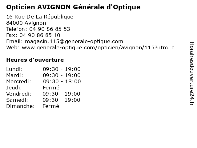 1 Société Générale (Distance: 0,12 km) 9 Rue de la république, 84000 Avignon association d'épargne et de crédit, atm, conseil en crédit, générale, organisme d'assurance auto, organisme d'assurance moto, organisme d'assurance-habitation, organisme d'assurance-vie, société 2 Écouter Voir - Optique & Audition Mutualiste (Distance: 0,14 km) 4 rue Viala, 84000 Avignon audition, lunettes, magasin, monture, mutualiste, opticien, optique, voir, écouter 3 Cabinet médial St Didier - Médecine générale (secrétariat ) (Distance: 0,16 km) 26 Rue de la République, 84000 Avignon cabinet, consultation, didier, docteur, générale, médecine, médial, santé, secrétariat, st 5 Opticien AVIGNON Optical Center (Distance: 0,21 km) 82 Rue Joseph Vernet, 84000 Avignon avignon, center, optical, opticien 6 Opticien Mobile - AVIGNON Optical Center (Distance: 0,21 km) 82 Rue Joseph Vernet, 84000 Avignon avignon, center, mobile, optical, opticien |