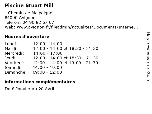 1 École Maternelle Publique Stuart Mill (Distance: 0,08 km) 1 Rue Robert de Genève, 84000 Avignon cours, education, maternelle, mill, publique, services, stuart, École, école 2 École Primaire Publique Stuart Mill B (Distance: 0,08 km) 1 Rue Robert de Genève, 84000 Avignon cours, education, mill, primaire, publique, services, stuart, École, école 3 Piscine Municipale - Hors vacances scolaires (Distance: 2,34 km) - Avenue Pierre de Coubertin, 84130 Le Pontet aqua, aquatique, hors, municipale, piscine, scolaires, vacances 4 Piscine Chevalier de Folard (Distance: 2,36 km) - Avenue Chevalier de Folard, 84000 Avignon aqua, aquatique, chevalier, de, folard, municipale, piscine 5 Elizabeth Stuart (Distance: 2,51 km) 18, rue St Agricol, 84000 Avignon accessoires, elizabeth, elizabeth stuart, mode femme, stuart 6 Piscine Jean Cément (Distance: 3,63 km) - Chemin de la Martelle, 84140 Montfavet aqua, aquatique, cément, jean, municipale, piscine |