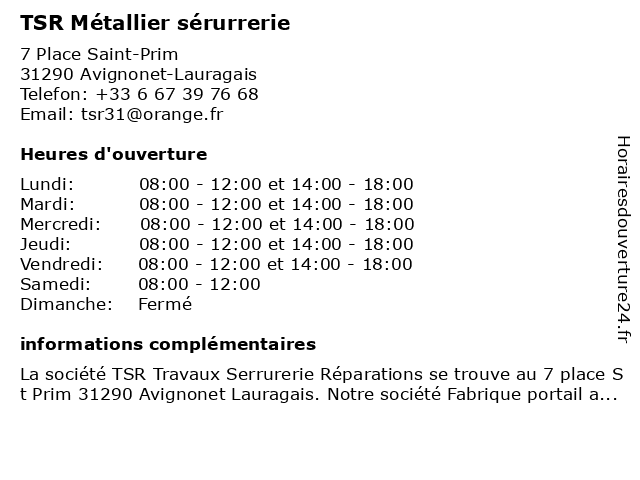 La société TSR Travaux Serrurerie Réparations se trouve au 7 place St Prim 31290 Avignonet Lauragais. Notre société Fabrique portail avec ou sans motorisation, garde corps de terrasse, verriè...