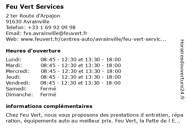 2 Feu Vert Services (Distance: 15,67 km) Route de Villoison, 91100 Villabé amortisseurs, ampoule, autoradio, batterie, chaussettes neige, chaînes neige, coffre de toit, feu, freinage, glacière, pneu, pneu 4 saisons, pneu hiver, remorque, révision, services, vert, vidange 3 FEU VERT SERVICES - GARAGE ROYER (Distance: 0,06 km) 2 ter Route d'Arpajon, 91630 Avrainville feu, garage, royer, services, vert 4 Camion Pizza Au Feu De Bois (Distance: 6,17 km) 17 Avenue Des Cigognes, 91220 Bretigny Sur Orge bois, camion, feu, guemas, olivier, pizza, restaurants 5 Fondation Jeunesse Feu Vert - Service Educatif 91 (Distance: 14,70 km) 85 Route de Grigny, 91130 Ris-Orangis 91, aemo, educatif, feu, fondation, jeunes, jeunesse, le, ris-orangis, service, vert, éducation, éducative 6 |