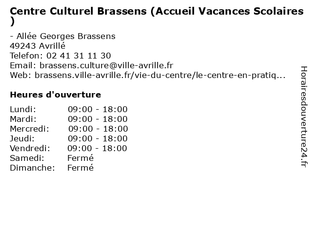 1 Centre Culturel Brassens (Accueil Périodes Scolaires) (Distance: 0,00 km) - Allée Georges Brassens, 49243 Avrillé accueil, activités, brassens, centre, culturel, périodes, scolaires, Évènements 2 Centre Culturel Brassens (Médiathèque Périodes Scolaires) (Distance: 0,00 km) - Allée Georges Brassens, 49243 Avrillé activités, brassens, centre, culturel, médiathèque, périodes, scolaires, Évènements 3 Centre Culturel Brassens (Médiathèque Vacances Scolaires) (Distance: 0,00 km) - Allée Georges Brassens, 49243 Avrillé activités, brassens, centre, culturel, médiathèque, scolaires, vacances, Évènements 4 E.Leclerc Espace Culturel (Distance: 1,75 km) Boulevard albert camus, 49100 Angers culturel, e.leclerc, espace, fournisseur de matériel audiovisuel, librairies, magasin de jeux vidéo, magasin de musique, matériel de photographie, matériel vidéo, services et matériel vidéo 5 T'es Rock Coco, Bistrot Culturel (Distance: 3,18 km) 16 Rue Beaurepaire, 49000 Angers bistrot, coco, culturel, rock, t'es 6 XY Boutique (Vacances Scolaires) (Distance: 3,72 km) 1 rue de l'Aiguillerie, 49100 Angers accessoires, boutique, cérémonie, mariage, scolaires, vacances, vêtements homme, xy |