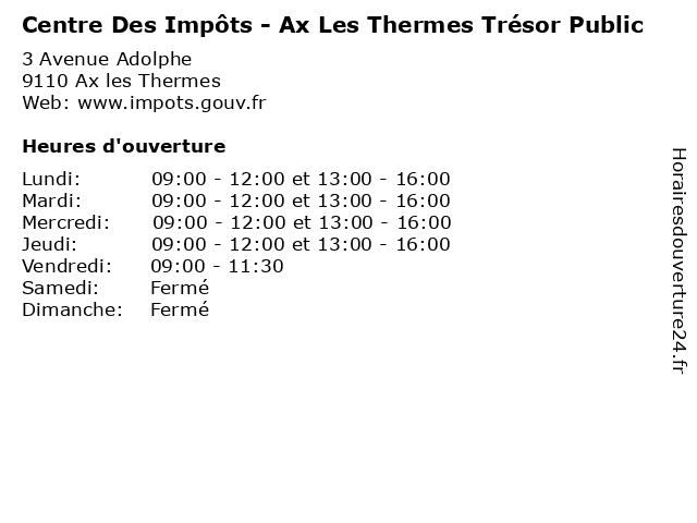Termes de recherche pour Centre Des Impôts - Ax Les Thermes Trésor Public:les, des, administration, services, centre, trésor, thermes, impôts, public, publics, ax |