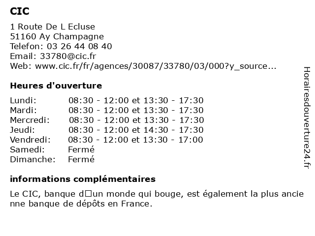 1 CIC (Distance: 0,00 km) 1 Route De L Ecluse, 51160 Ay Champagne cic, compagnie de téléphone, organisme d'assurance 2 CIC (Distance: 3,25 km) 4 Place De La Republique, 51200 Epernay cic, compagnie de téléphone, organisme d'assurance 3 CIC (Distance: 16,64 km) 18 Rue De Chalons, 51130 Blancs Coteaux cic, compagnie de téléphone, organisme d'assurance 4 CIC (Distance: 18,61 km) 7 Avenue Du Roussillon, 51350 Cormontreuil cic, compagnie de téléphone, organisme d'assurance 5 CIC Agence (Distance: 4,98 km) 4 PLACE DE LA REPUBLIQUE, 51204 EPERNAY agence, casteljaloux, cic, l'argent, l'épargne, la trésorerie, les banques, les finances, les prêts 6 CIC Agence (Distance: 6,34 km) 1 ROUTE D'EPERNAY, 51160 AY agence, casteljaloux, cic, l'argent, l'épargne, la trésorerie, les banques, les finances, les prêts |