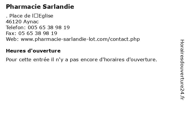 1 Cabinet SARLANDIE (Distance: 51,60 km) 6-8 boulevard Eugène Le Roy, 24200 Sarlat-la-Canéda audit, cabinet, conseil, expertise comptable, fiscalité, juridique, paie, sarlandie, social 2 Pharmacie Louargant (Distance: 3,87 km) . Rue Principale, 46120 Leyme homéopathie, louargant, médicaments, orthopédie, parapharmacie, pharmacie 3 Dr Marie-Agnes Bouchetoux - Chirurgien-dentiste - secrétariat (Distance: 8,53 km) 171 Impasse Antoine de Saint Exupéry, 46400 Saint-Céré agnes, bouchetoux, chirurgien, chirurgien-dentiste, dentiste, dr, marie, médecins, médicaments, santé, secrétariat, spécialiste 4 Pharmacie Auriel (Distance: 8,57 km) . route départementale 940, 46120 Lacapelle Marival auriel, homéopathie, médicaments, orthopédie, parapharmacie, pharmacie 5 Pharmacie Gineste (Distance: 8,96 km) 1 place de la République, 46400 Saint Céré gineste, homéopathie, médicaments, orthopédie, parapharmacie, pharmacie 6 Pharmacie Sourie (Distance: 8,97 km) 3 boulevard Gambetta, 46400 Saint Céré homéopathie, médicaments, orthopédie, parapharmacie, pharmacie, sourie |