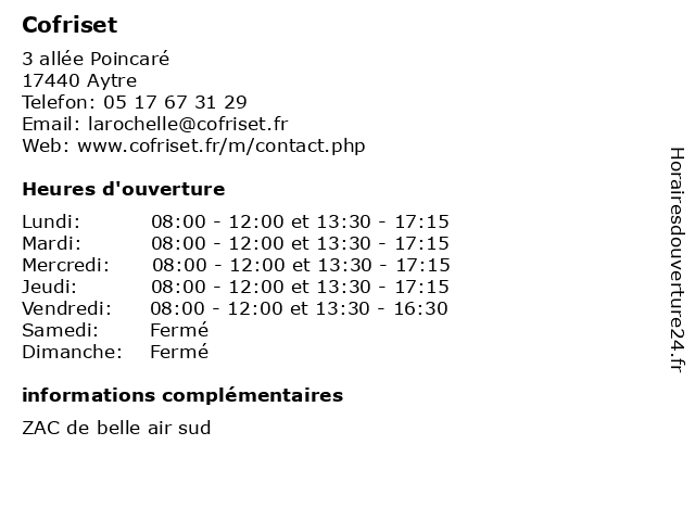 Vendredi | 08:00-12:00 et 13:30-16:30 |