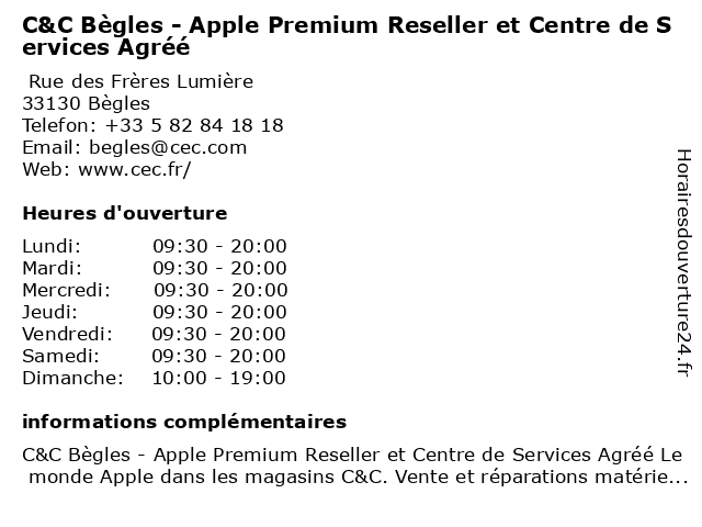 1 Effia (Entrées Resaplace Premium) (Distance: 3,46 km) 1 Rue Armagnac, 33800 Bordeaux effia, entrées, parking, premium, resaplace, services, stationnement 2 Apple Sainte-Catherine (Distance: 6,13 km) 2-4 Rue Sainte-catherine, 33000 Bordeaux apple, atelier de réparation de téléphones mobiles, catherine, réparation d’ordinateurs, sainte 3 Apple Store (Distance: 6,13 km) 2-4 rue Sainte-Catherine, 33000 Bordeaux apple, portable, store, tablettes, téléphone, téléphonie 4 C&C Bordeaux - Revendeur Agréé Apple et Centre de Services Agréé (Distance: 6,56 km) 1 Allées de Chartres, 33000 Bordeaux agréé, apple, bordeaux, c&c, centre, de, et, revendeur, services 5 The Golden Apple (Distance: 7,22 km) 46 rue Borie, 33300 Bordeaux apple, bistrot, café, golden, restaurant, the 6 Premium Shop (Distance: 8,22 km) . Centre Commercial, 33310 Lormont accessoires, beaute&sante, cafe, chaussures, enfants, mode femmes, mode hommes, optique, premium, restaurant, service, shop, sport |