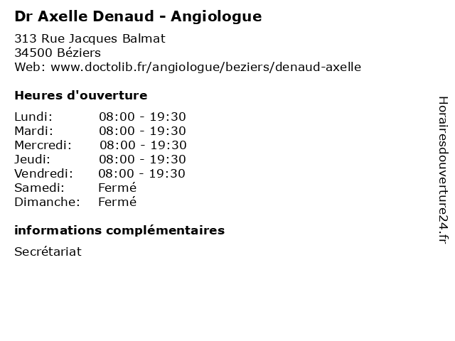 1 Maître Axelle Montpellier - Avocate (Distance: 0,16 km) 13 Rue du Docteur Fleming, 34500 Béziers avocate, avocats, axelle, civils, droits, juridiques, maître, montpellier 2 Dr Pierre-Marie Noël de la Paquerie - Angiologue - secrétariat (Distance: 1,83 km) 54 Avenue Pierre Verdier, 34500 Béziers angiologue, consultation, de, docteur, dr, la, marie, med, médecin, médecine, noël, paquerie, pierre, secrétariat, traitement 3 Dr Jean-François Seveyrac - Angiologue - secrétariat (Distance: 1,83 km) 54 Avenue Pierre Verdier, 34500 Béziers angiologue, consultation, docteur, dr, françois, jean, med, médecin, médecine, secrétariat, seveyrac, traitement 4 Dr Axelle Denaud - Radiologue (Distance: 2,19 km) 2 rue Valentin Haüy, 34525 Béziers axelle, béziers, centre, denaud, diagnostique, dr, hospitalier, imagerie, radiologie, radiologue, thérapeutique 6 Dr Pierre-Marie Noël de la Paquerie - Angiologue - secrétariat (Distance: 19,03 km) 3 Rue Pasteur, 34120 Pezenas angiologue, consultation, de, docteur, dr, la, marie, med, médecin, médecine, noël, paquerie, pierre, secrétariat, traitement |