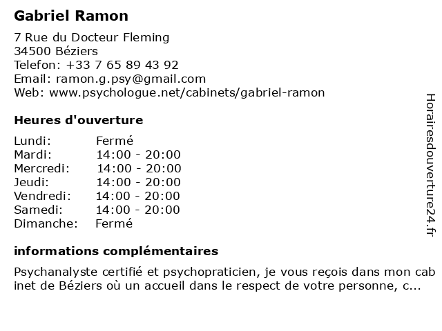 1 Dr Gabriel Venturini - Médecin généraliste (Distance: 0,16 km) 313 Rue Jacques Balmat, 34500 Beziers consultation, docteur, dr, gabriel, générale, généraliste, medecins, médecin, médecine, rendez, santé, sur, venturini, vous 2 Emilie Gabriel - Sage-femme (Distance: 0,48 km) 2 rue Valentin Haüy, 34500 Béziers consultation, docteur, dr, emilie, femme, gabriel, med, médecin, sage, traitement 3 Le Clos Saint Gabriel (Distance: 1,67 km) 1506 Avenue Joseph Lazare, 34500 Béziers clos, gabriel, le, saint 5 Gabriel Fabre - Ostéopathe (Distance: 1,91 km) 54-56 Avenue Pierre Verdier, 34500 Béziers fabre, gabriel, osteo, osteopathe, ostéopathe, sante, soins 6 Dr Gabriel Razakamahefa - Radiologue (Distance: 2,28 km) 2 rue Valentin Haüy, 34525 Béziers béziers, centre, diagnostique, dr, gabriel, hospitalier, imagerie, radiologie, radiologue, razakamahefa, thérapeutique |