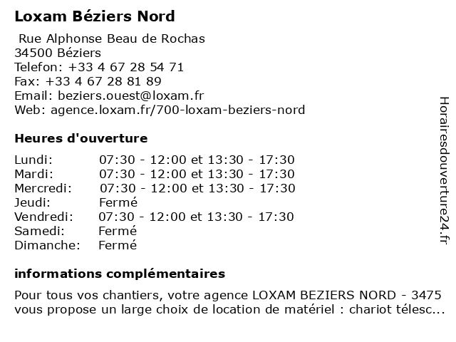 1 Sonepar Béziers Nord (Distance: 0,42 km) 346 Rue Augustin Jean Fresnel, 34500 Béziers béziers, nord, sonepar 2 La Gare du Nord - pour les accueils réguliers (Distance: 2,65 km) 10 Rue du 6 juin 1944, 34500 Béziers accueils, caregivers houses, child care, du, family home, gare, home care, kindergartens, la, les, micro-nurseries, nord, parental home, pour, réguliers 3 La Gare du Nord - pour les accueils occasionnels (Distance: 2,65 km) 10 Rue du 6 juin 1944, 34500 Béziers accueils, caregivers houses, child care, du, family home, gare, home care, kindergartens, la, les, micro-nurseries, nord, occasionnels, parental home, pour 4 Loxam (Distance: 4,19 km) 38 Route De Narbonne, 34500 Beziers atelier, electrique, loxam, nouveaux materiel, remblayage, terrassement, transport 6 Loxam Narbonne La Coupe (Distance: 31,03 km) 6 Impasse Edouard Branly, 11100 Narbonne coupe, la, loxam, narbonne |