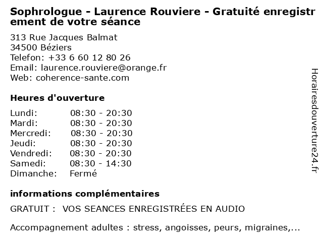 1 Dr Laurence Calvet Lacotte - Ophtalmologue (Distance: 0,12 km) - Rue du Docteur Fleming, 34500 Béziers calvet, dr, lacotte, laurence, ophtalmologie, ophtalmologistes, ophtalmologue, vision 2 Dr Laurence Jost - Médecin nucléaire - secrétariat (Distance: 0,69 km) 211 Rue Dimitri Amilakvari, 34500 Béziers dr, jost, laurence, médecin, médecins, médicaments, nucléaire, santé, secrétariat, spécialiste 3 Service de la publicité foncière et de l'enregistrement (SPFE) (Distance: 1,92 km) 11 avenue Pierre-Verdier, 34322 Beziers administration, assoc, de, et, foncière, l'enregistrement, la, publicité, service, services, services publics, spfe 4 Maître Laurence Montazel - Avocate (Distance: 2,54 km) 8 Rue Amiral Courbet, 34500 Béziers avocate, avocats, civils, droits, juridiques, laurence, maître, montazel 5 Vendez Votre Voiture (Distance: 2,68 km) 3 rue des Amandiers, 34500 Béziers achat, automobile, reprise, vendez, voiture, votre 6 Laurence Pfauwadel - Psychothérapeute (Distance: 2,70 km) 26bis Avenue Président Wilson, 34500 Béziers laurence, pfauwadel, psy, psychiatre, psychothérapeute, sante, soins |