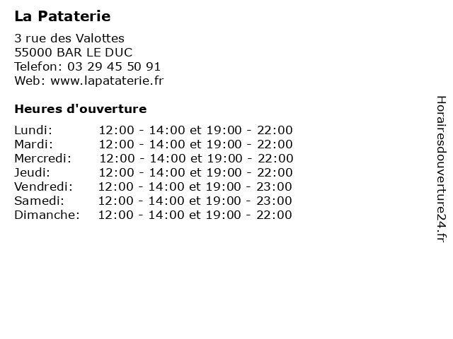 | Dimanche | 12:00-14:00 et 19:00-22:00 |