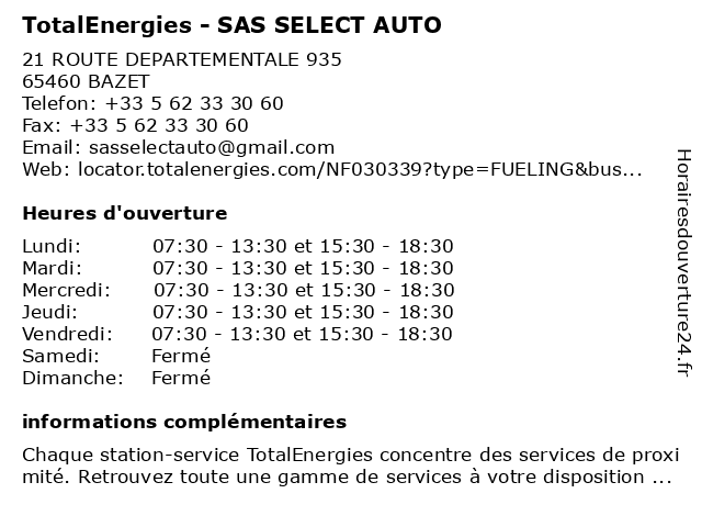 Termes de recherche pour TotalEnergies - SAS SELECT AUTO:auto, sas, total, select, gas station, station service, tankstelle, totalenergies |
