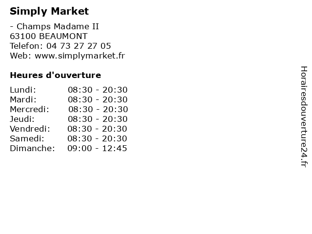 1 2 Simply Market (Distance: 1,80 km) 19 boulevard Loucheur, 63000 CLERMONT-FERRAND market, simply, supermarchés en franc 3 Simply Market (Distance: 2,20 km) 57 boulevard Cote Blatin, 63000 CLERMONT-FERRAND market, simply, supermarchés en franc 4 Simply Market (Distance: 3,42 km) - Carrefour Europe, 63400 CHAMALIERES market, simply, supermarchés en franc 5 Simply Market (Distance: 4,45 km) 19 rue des Chanelles, 63100 CLERMONT FERRAND market, simply, supermarchés en franc 6 Simply Market (Distance: 8,46 km) - Avenue des Domes, 63800 COURNON D\'AUVERGNE market, simply, supermarchés en franc |