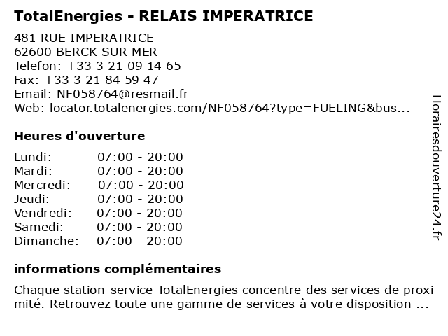 Termes de recherche pour TotalEnergies - RELAIS IMPERATRICE:relais, total, impératrice, gas station, station service, tankstelle, totalenergies |