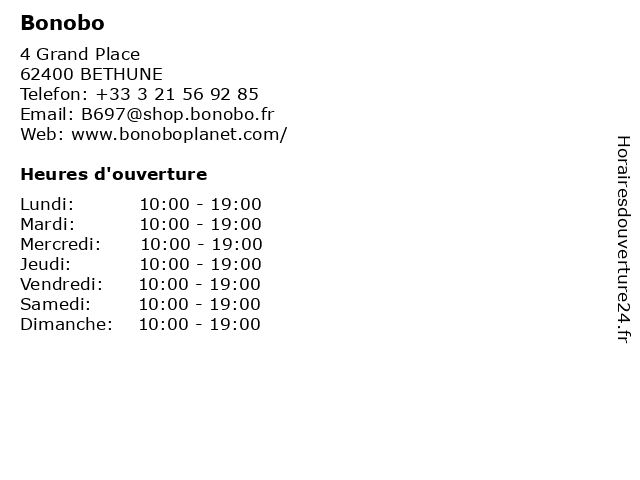 2 Bonobo (Distance: 8,72 km) 43 Route Nationale, 62950 Noyelles auchan, bonobo, centre, commercial, noyelles 3 Bonobo (Distance: 10,71 km) . RN 941, 62138 Auchy-les-Mines beaute, bonobo, cafe, chaussures, enfants, hommes, lingerie, mode femmes, restaurant, sport 4 Bonobo (Distance: 11,17 km) 41 Route nationale, 62138 Auchy-les-Mines blazer femme, bonobo, boutique vêtement, cardignan femme, chaussures femme, gilet femme, jean femme, jean homme, magasin vêtement, magasin vêtements mixte, manteau femme, manteau homme, mode femme, pull femme, pull homme, robe femme, sac femme, t-shirt femme, t-shirt homme, tailleur femme, top femme, vêtement femme, vêtement homme, vêtement mixte 5 Bonobo (Distance: 15,31 km) Route de la Bassé, 62880 Vendin-le-Vieil blazer femme, bonobo, boutique vêtement, cardignan femme, chaussures femme, gilet femme, jean femme, jean homme, magasin vêtement, magasin vêtements mixte, manteau femme, manteau homme, mode femme, pull femme, pull homme, robe femme, sac femme, t-shirt femme, t-shirt homme, tailleur femme, top femme, vêtement femme, vêtement homme, vêtement mixte 6 Vib's (Cache Cache - Bonobo - Bréal) (Distance: 5,48 km) Rue Jean Joseph Etienne Lenoir, 62700 Bruay-la-Buissière bonobo, bréal, cache, vib's |