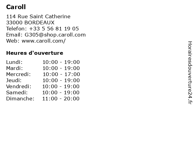 1 Caroll (Distance: 0,33 km) 11/19 Rue Sainte-Catherine, 33036 Bordeaux blazer femme, cardignan femme, caroll, chaussures femme, gilet femme, jean femme, magasin femme, magasin vêtements, manteau femme, mode femme, pull femme, robe femme, sac femme, t-shirt femme, tailleur femme, top femme, vêtements femmes 2 Caroll (Distance: 0,52 km) 103 Rue Porte Dijeaux, 33000 Bordeaux blazer femme, cardignan femme, caroll, chaussures femme, gilet femme, jean femme, magasin femme, magasin vêtements, manteau femme, mode femme, pull femme, robe femme, sac femme, t-shirt femme, tailleur femme, top femme, vêtements femmes 4 Caroll (Distance: 6,03 km) C/C Rives D'Arcins, 33130 BEGLES blazer femme, cardignan femme, caroll, chaussures femme, gilet femme, jean femme, magasin femme, magasin vêtements, manteau femme, mode femme, pull femme, robe femme, sac femme, t-shirt femme, tailleur femme, top femme, vêtements femmes 5 Caroll (Distance: 6,51 km) 17 Avenue de la Somme, 33700 Mérignac blazer femme, cardignan femme, caroll, chaussures femme, gilet femme, jean femme, magasin femme, magasin vêtements, manteau femme, mode femme, pull femme, robe femme, sac femme, t-shirt femme, tailleur femme, top femme, vêtements femmes 6 |