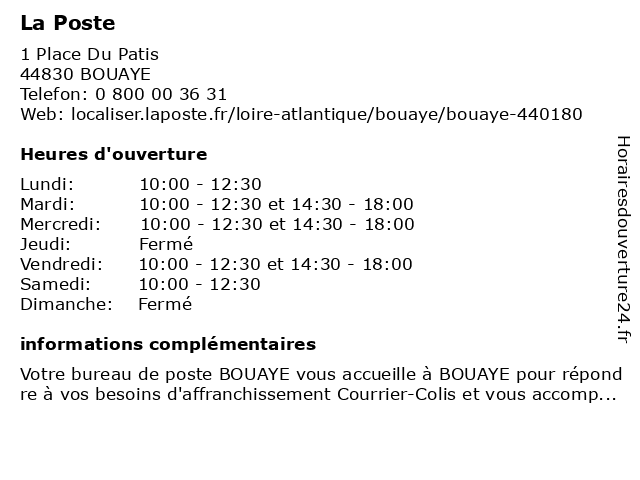 1 La Poste (Distance: 3,75 km) 13 Rue de la Mairie, 44830 Brains colis, express chronopost, expédition, la, poste, réexpédition internationale, service, suivi du courrier 3 La Poste (Distance: 5,02 km) - Place Millénia, 44860 Saint-Aignan-Grandlieu colis, express chronopost, expédition, la, poste, réexpédition internationale, service, suivi du courrier 5 La Poste (Distance: 6,32 km) 1 Avenue du 11 Novembre, 44640 Saint Jean de Boiseau colis, express chronopost, expédition, la, poste, réexpédition internationale, service, suivi du courrier 6 La Poste (Distance: 6,43 km) 11 Quai Besnard, 44610 Indre agence, assurance, banque, banque postale, bureau de poste, chronopost, colis, courrier, dps, expéditions internationales, la, point, postale, poste, relais, timbres, téléphonie, ups, western union |