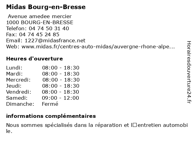 1 Midas (Distance: 0,81 km) - Av Amédée Mercier, 01000 Bourg-en-Bresse entretien, midas, révisions, service, services d'automobiles, vidanges 3 Midas (Distance: 46,87 km) 176 Bld louis blanc, 69400 VILLEFRANCHE SUR SAONE atelier de réparation automobile, magasin de pièces automobiles, midas, service de climatisation automobile 4 Midas Service (Distance: 53,97 km) 2 Avenue Jean Jaurès, 69150 Décines Charpieu entretien, midas, révisions, service, services d'automobiles, vidanges 5 Midas Service (Distance: 56,06 km) 83-85 Cours Emile Zola, 69100 Villeurbanne entretien, midas, révisions, service, services d'automobiles, vidanges 6 Midas Service (Distance: 56,78 km) 35 Boulevard Jules Ferry, 39000 Lons-le-Saunier entretien, midas, révisions, service, services d'automobiles, vidanges |